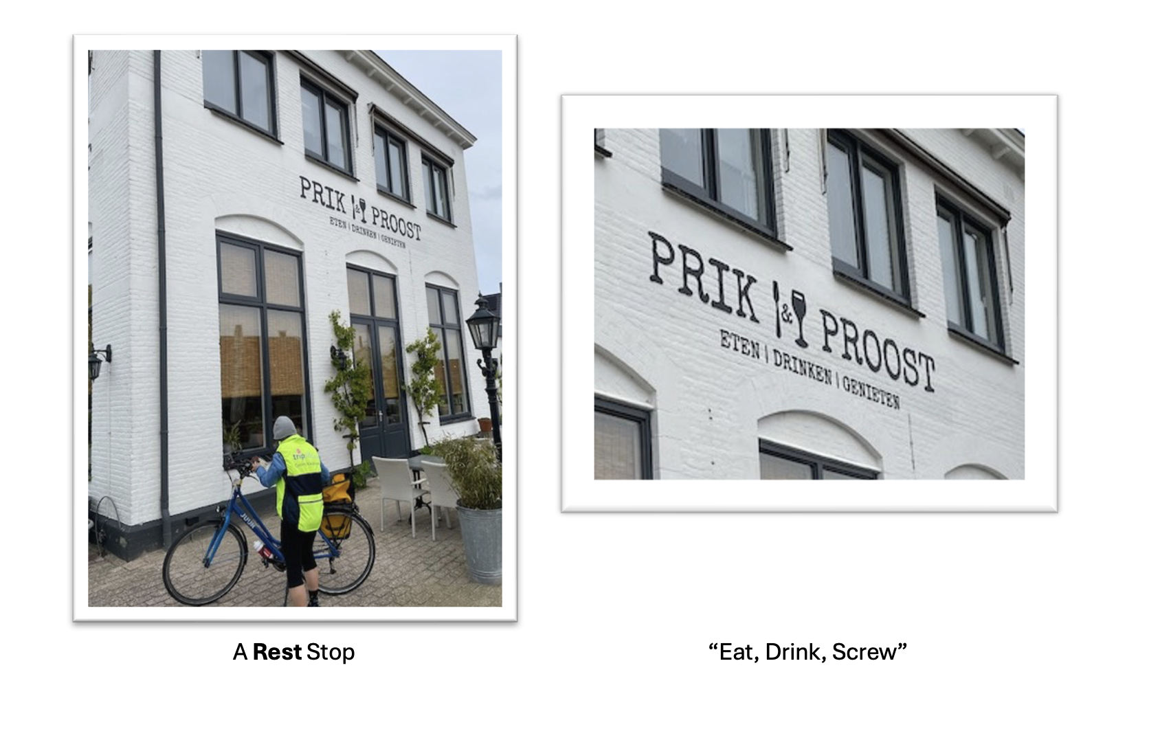 Part of the culture – and, a solution to intermittent rain – was to stop for a break near the end of the tour, as the drizzle increased to honest-to-goodness rain.  At 11:30 am, I would usually pick coffee as a good beverage for a rain delay.   But, in the Netherlands, real bikers opt for a Kopstootje, a shot of Genever (Dutch version of gin with juniper berries and spices), washed down with a glass of beer, and (to cushion the stomach) a hard-boiled egg.