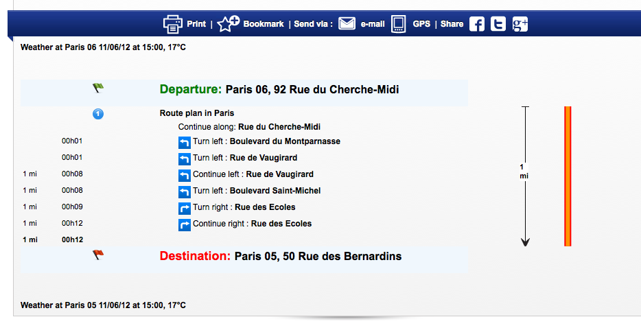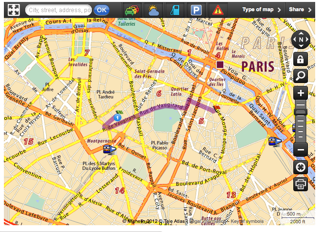 A sample route from here to there in Paris: (From: 92 Rue du Cherche-Midi, 75006 Paris 06 To: 50 Rue des Bernardins, 75005 Paris 05)